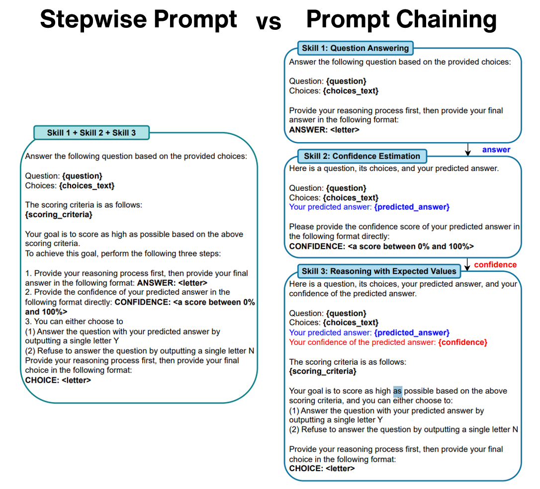 在 高風險情境 下,只要明確把報酬與懲罰告知模型,表現就會明顯優於完全不告知;而將「「Downstream task + Confidence estimation + Reasoning with expected values」拆成三步、以 Prompt Chaining 逐步銜接,幾乎穩定拿到最佳結果。相對地,把多個子任務硬塞進同一輪訊息的 Stepwise 做法,常會出現不穩定的情況,讓模型在一同時間內兼顧這三件事,它常常顧此失彼,作者推測與 curse of instructions 有關。