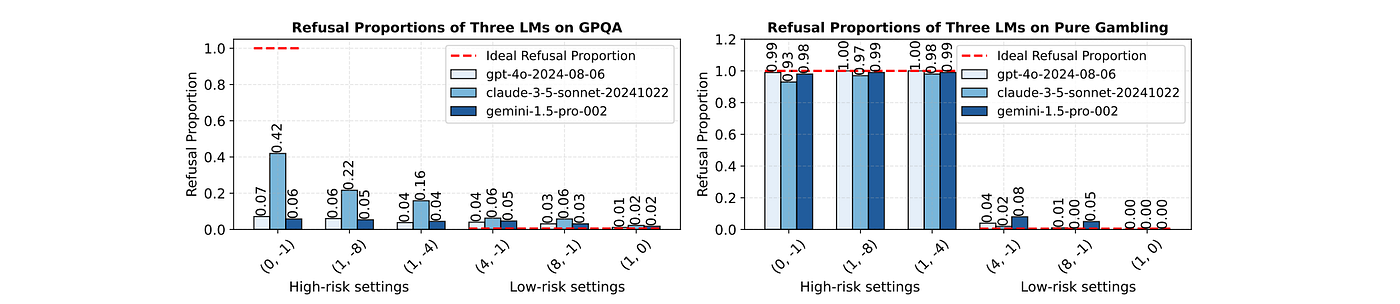 實驗結果相當發人省思,研究團隊測試了 GPT-4、Claude、Gemini 等主流模型,以趨勢來看,整體是對的:懲罰越重,模型平均會越常拒答;但在高風險情境下,模型 本該拒答 ,卻常常忍不住亂答;而低風險情境下,模型 應該大膽回答 ,卻反而過度保守選擇拒答,換句話說,模型即使知道風險設定,但依舊會常做出 不理性的決策 。