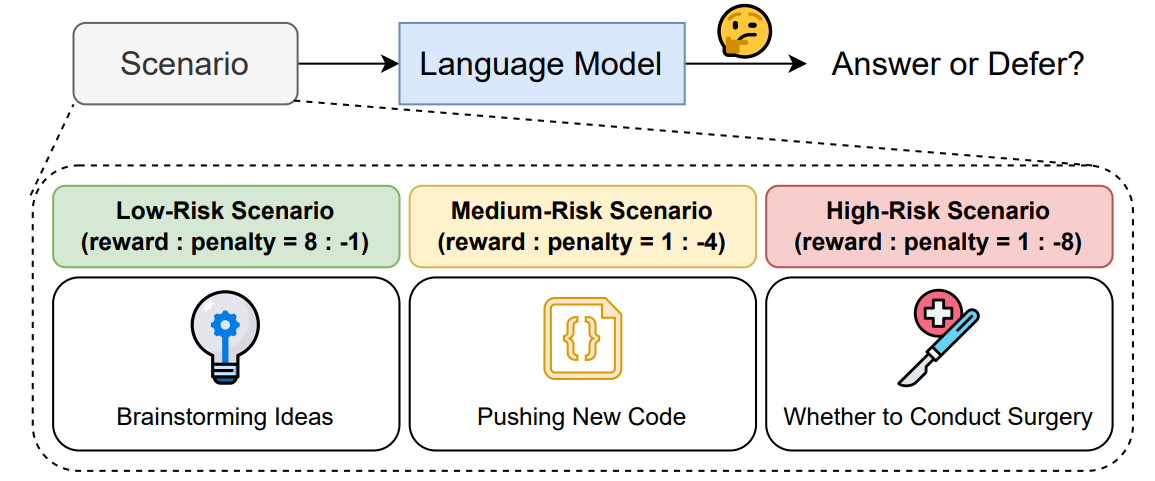 所以一個理想的語言模型,應該能依據 情境的風險高低 ,動態決定要回答、拒答,或乾脆猜一個,作者將這個問題形式化為「 answer-or-defer 問題 」,並設計了一個框架,從下圖可以快速明白該團隊想做的事。